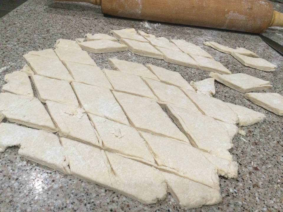 Slice dough about an inch wide then cross cut the dumplings about an inch wide too.