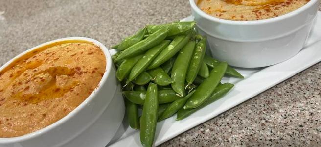 2. Transfer to bowl, cover and refrigerate. Bring to room temperature to serve. Top with a drizzle of olive oil and sprinkle with smoked paprika. Serve with pita bread, pita chips, carrots snow peas (whatever you like)